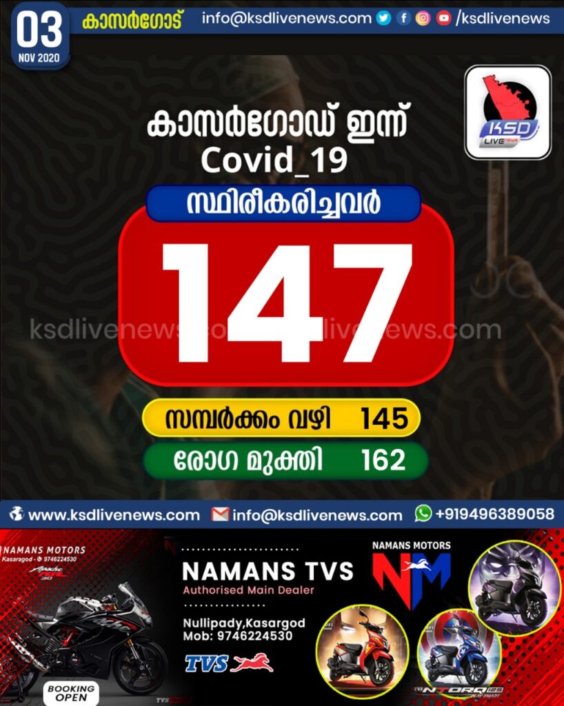 കാസര്കോട് ജില്ലയില് 147 പേര്ക്ക് കോവിഡ്, 162 പേര്ക്ക് രോഗമുക്തി