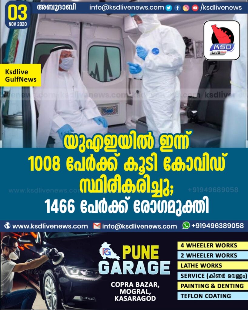 യുഎഇയില് ഇന്ന് 1008 പേര്ക്ക് കൂടി കോവിഡ് സ്ഥിരീകരിച്ചു ; 1466 പേര്ക്ക് രോഗമുക്തി