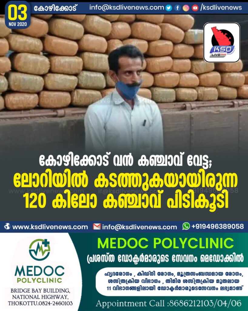 കോഴിക്കോട് വന് കഞ്ചാവ് വേട്ട ; ലോറിയില് കടത്തുകയായിരുന്ന 120 കിലോ കഞ്ചാവ് പിടികൂടി