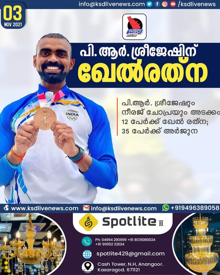 മലയാളി ഹോക്കി താരം പിഎസ് ശ്രീജേഷും ടോക്കിയോ ഒളിമ്പിക്സിൽ സ്വർണമെഡൽ ജേതാവായ ജാവലിൻ ത്രോ താരം നീരജ് ചോപ്രയും അടക്കം 12 കായിക താരങ്ങൾക്ക് ഈ വർഷത്തെ ഖേൽ രത്ന പുരസ്കാരം. കായിക മന്ത്രാലയമാണ് പുരസ്കാരങ്ങൾ പ്രഖ്യാപിച്ചത്. ഒളിംപിക്സിൽ വെള്ളി മെഡൽ നേടിയ ഗുസ്തി താരം രവി ദാഹിയ ഒളിമ്പിക്സ് വെങ്കല ജേതാവ് ലോവ്ലിന ബോർഗോഹൈൻ എന്നിവരും പുരസ്കാരത്തിന് അർഹരായി.