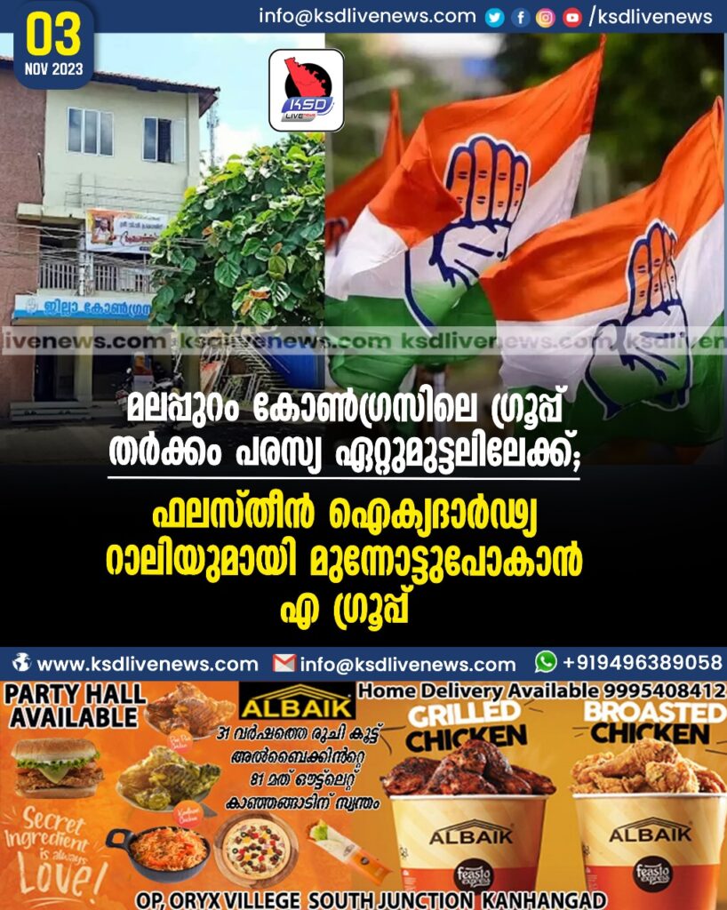 മലപ്പുറം കോണ്ഗ്രസിലെ ഗ്രൂപ്പ് തര്ക്കം പരസ്യ ഏറ്റുമുട്ടലിലേക്ക്; ഫലസ്തീൻ ഐക്യദാര്ഢ്യ റാലിയുമായി മുന്നോട്ടുപോകാന് എ ഗ്രൂപ്പ്