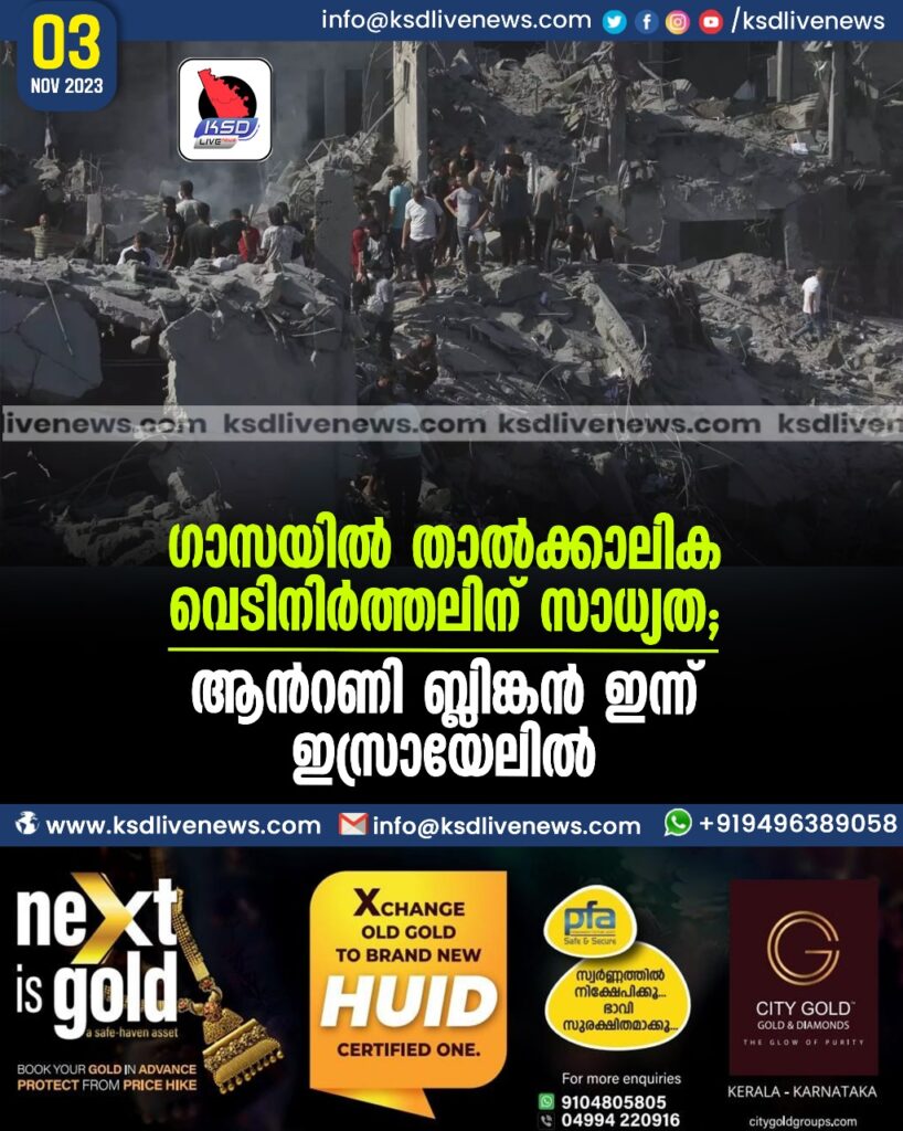 ഗസ്സയില് താല്ക്കാലിക വെടിനിര്ത്തലിന് സാധ്യത; ആന്റണി ബ്ലിങ്കന് ഇന്ന് ഇസ്രായേലില്