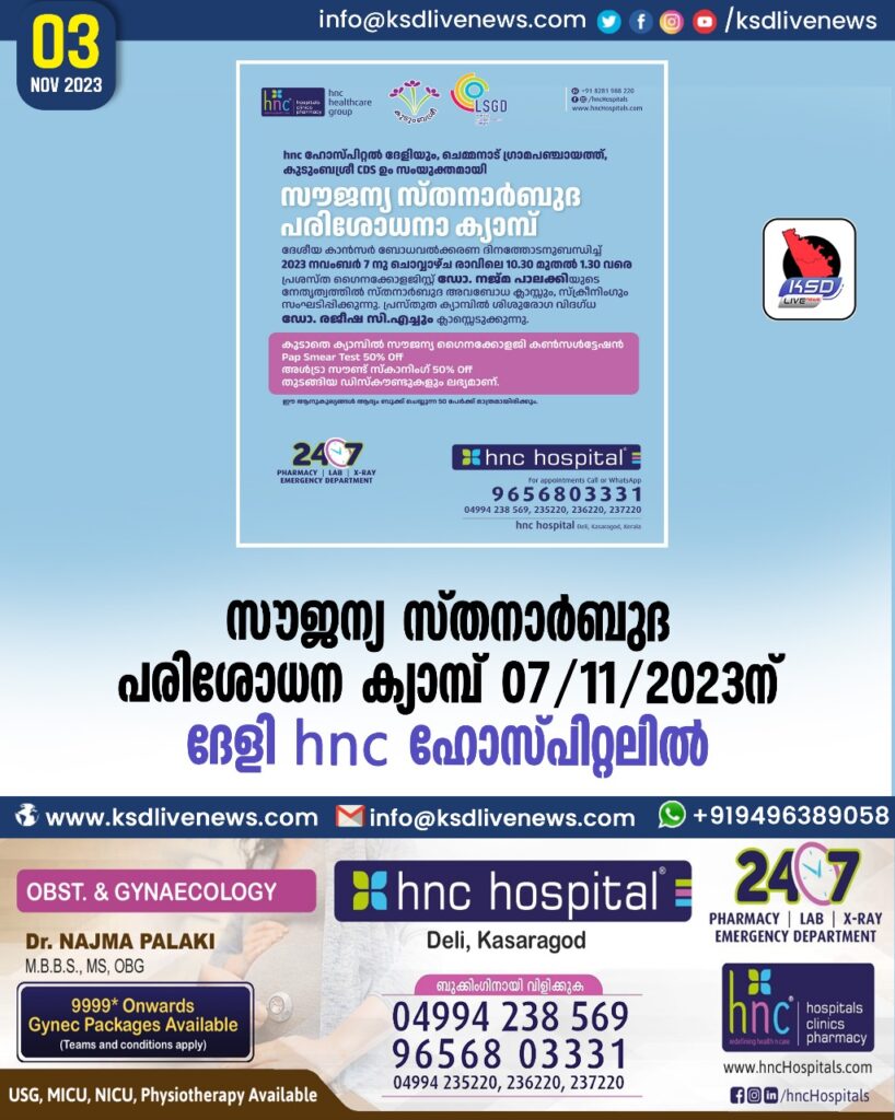 സൗജന്യ സ്തനാർബുദ പരിശോധന ക്യാമ്പ് ദേശീയ കാൻസർ ബോധവൽകരണ ദിനത്തോടനുബന്ധിച്ചു ചെമ്മനാട് ഗ്രാമപഞ്ചായത്ത്, കുടുംബശ്രീ CDS ഉം സംയുക്തമായി പ്രശസ്ത ഗൈനകോളജിസ്റ് ഡോ. നജ്മ പാലക്കിയും ശിശുരോഗ വിദഗ്ദ്ധയായ ഡോ. രജീഷ സി എച് എന്നിവരുടെ നേതൃത്വത്തിൽ 07/11/2023 ചൊവ്വാഴ്ച രാവിലെ 10:30 മുതൽ 1:30 വരെ hnc ഹോസ്പിറ്റൽ ദേളിയിൽ സ്തനാർബുദ അവബോധന ക്ലാസ്സും സ്ക്രീനിംഗും സംഘടിപ്പിച്ചിരിക്കുന്നു. സൗജന്യ ഗൈനകോളജി കൺസൾട്ടേഷൻ കൂടാതെ Pap Smear Test, അൾട്രാസൗണ്ട് സ്കാനിംഗ് തുടങ്ങിയവയ്ക്ക് ഡിസ്കൗണ്ടും ലഭ്യമാണ്.