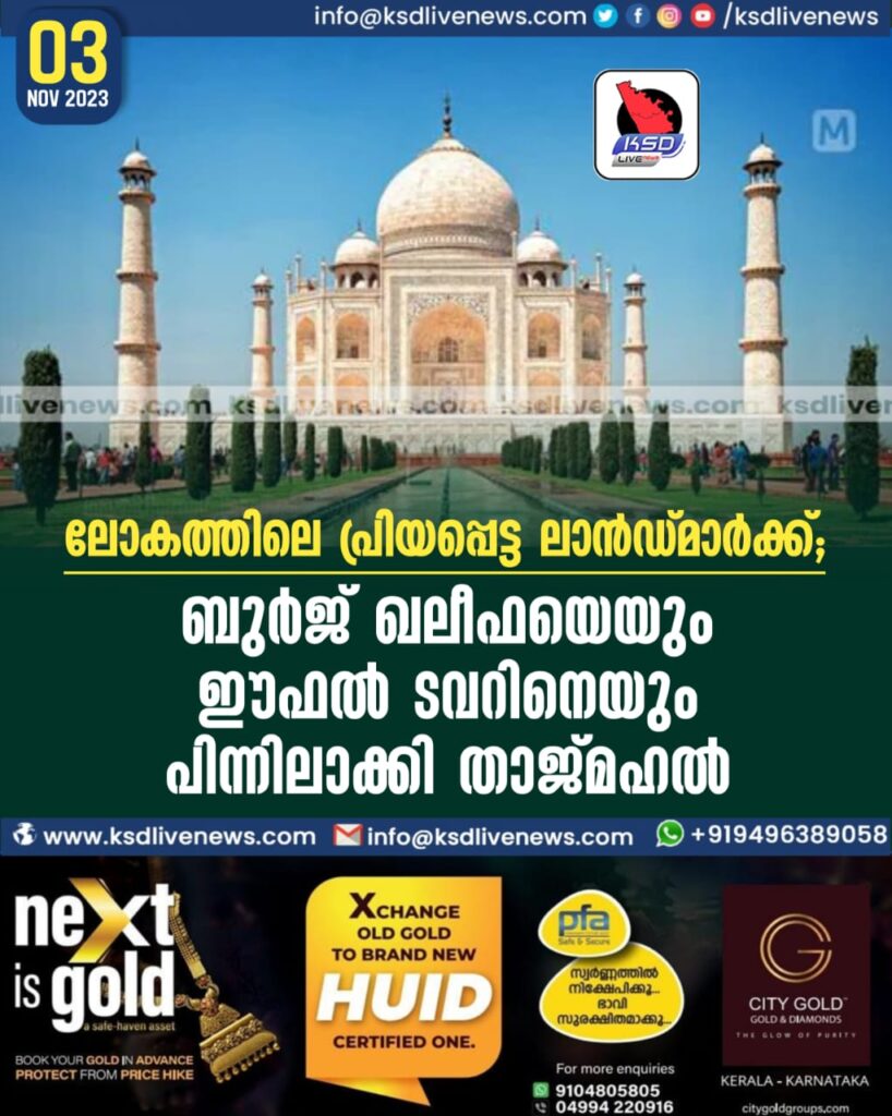 ലോകത്തിലെ പ്രിയപ്പെട്ട ലാന്ഡ്മാര്ക്ക്; ബുര്ജ്ഖലീഫയെയും ഈഫല് ടവറിനെയും പിന്നിലാക്കി താജ്മഹല്