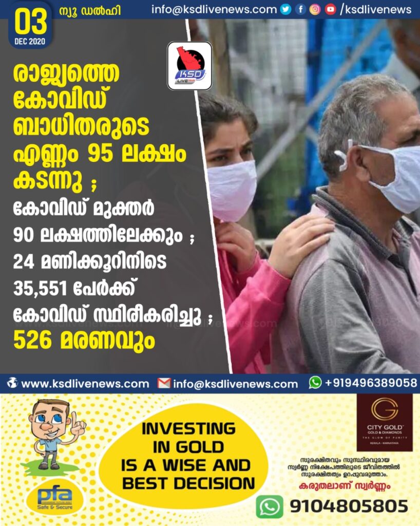 രാജ്യത്തെ കോവിഡ് ബാധിതരുടെ എണ്ണം 95 ലക്ഷം കടന്നു ; കോവിഡ് മുക്തർ 90 ലക്ഷത്തിലേക്കും ;