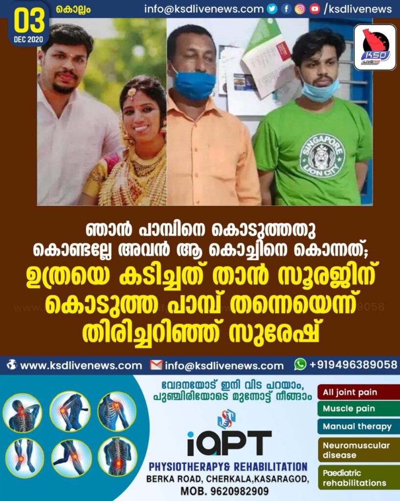 ഞാൻ പാമ്പിനെ കൊടുത്തതു കൊണ്ടല്ലേ . അവൻ ആ കൊച്ചിനെ കൊന്നത് ; ഉത്രയെ കടിച്ചത് താൻ സൂരജിന് കൊടുത്ത പാമ്പ് തന്നെയെന്ന് തിരിച്ചറിഞ്ഞ് സുരേഷ്
