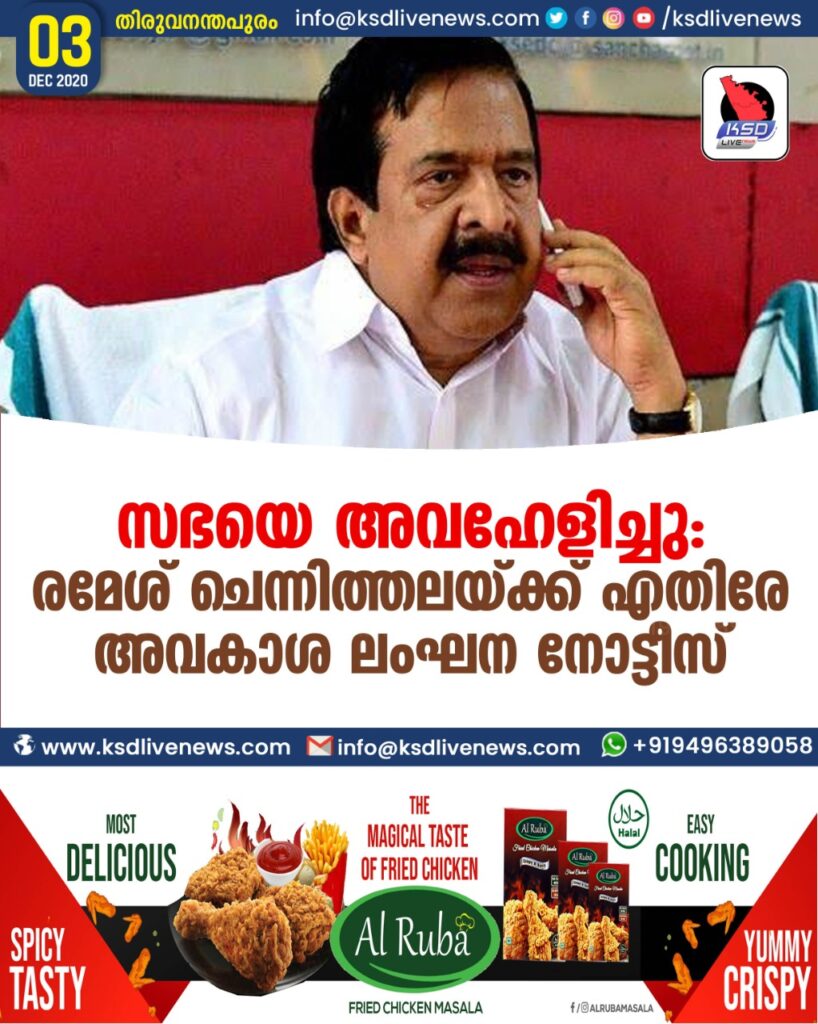 സഭയെ അവഹേളിച്ചു: രമേശ് ചെന്നിത്തലയ്ക്ക് എതിരേ അവകാശ ലംഘന നോട്ടീസ്