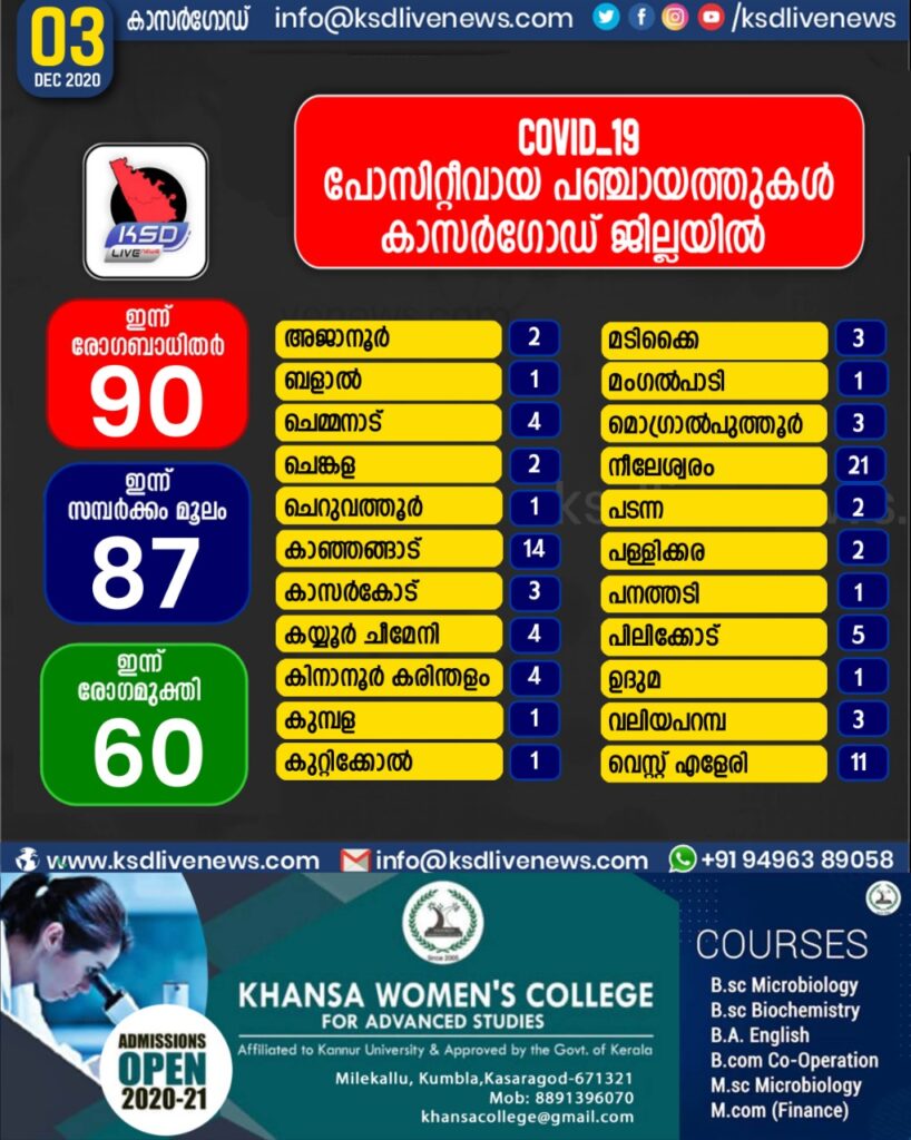 കാസർഗോഡ് ജില്ലയിൽ ഇന്ന് കോവിഡ് സ്ഥിരീകരിച്ചവരുടെ തദ്ദേശ സ്വയംഭരണ സ്ഥാപനം തിരിച്ചുള്ള കണക്ക്