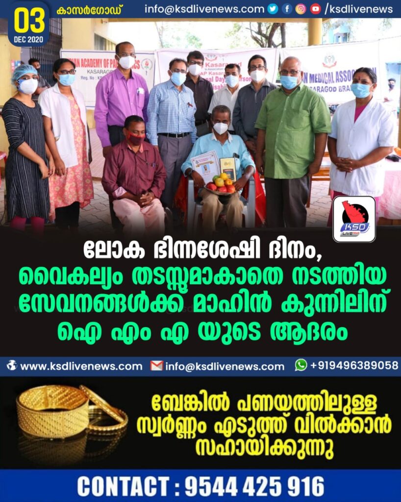 കാസർകോട് : ഇന്ത്യൻ മെഡിക്കൽ അസോസിയേഷനും ( ഐ എം എ ) ഇന്ത്യൻ അക്കാദമി ഓഫ് പീഡ്രിയാട്രിക് ( ഐ എ പി ) എന്നിവയുടെ നേതൃത്വത്തിൽ ലോക ഭിന്നശേഷി ദിനം ആചരിച്ചു, ഇതിൻ്റെ ഭാഗമായി വൈകല്യം തടസ്സമാകാതെ കാസർകോടിൻ്റെ സേവന – കാരുണ്യ പ്രവർത്തനങ്ങളിൽ നിറസാന്നിധ്യവും കോവിഡ് വാര്യരും പൊതു പ്രവർത്തകനുമായ മാഹിൻ കുന്നിലിനെ ചടങ്ങിൽ ആദരിച്ചു, ജനറൽ ആശുപത്രി സുപ്രണ്ട് ഡോ രാജറാം ഉപഹാരം സമ്മാനിച്ചു, ഐ എം എ പ്രസിഡണ്ട് ഡോ : നാരായണ നായക് അധ്യക്ഷത വഹിച്ചു, ഐ എസ് എ ദേശീയ പ്രസിഡൻ്റ് ഡോ വെങ്കിട്ട ഗിരി മുഖ്യാതിഥിയായിരുന്നു. റോട്ടറി ക്ലബ്ബ് പ്രസിഡണ്ട് ഡോ ജനാർദ്ധന നായക്, ഐ എ പി പ്രസിഡണ്ട് ഡോ ജിതേന്ദ്ര റൈ,, മെഡിക്കൽ ബോർഡ് അംഗം ഡോ ക്യഷ്ണൻ നായിക്, നഴ്സിംഗ് സുപ്രണ്ട് സ്നിഷി, ഹെൽത്ത് ഇൻസ്പെക്ടർ ബാലചന്ദ്രൻ, വേണുഗോപാൽ തുടങ്ങിയവർ സംബന്ധിച്ചു, ലോക് ഡൗൺ കാലത്തും അല്ലാതെയും സേവന പ്രവർത്തനങ്ങളിൽ നിറസാന്നിധ്യമാണ് മാഹിൻ.ജനറൽ ആശുപത്രി കേന്ദ്രീകരിച്ചു നടക്കുന്ന ജീവകാരുണ്യ പ്രവർത്തനങ്ങളുടെ മുൻ നിരയിലും മാഹിൻ കുന്നിലുണ്ട്.