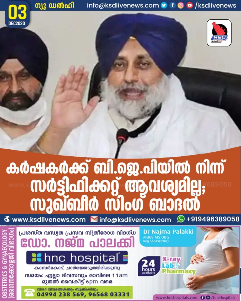 കർഷകർക്ക് ബി.ജെ.പിയിൽ നിന്ന് സർട്ടിഫിക്കറ്റ് ആവശ്യമില്ല ; സുഖ്ബീർ സിംഗ് ബാദൽ