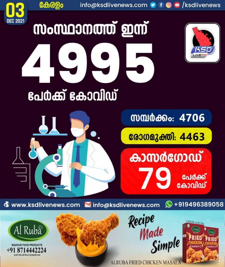 സംസ്ഥാനത്ത് ഇന്ന് 4995 പേർക്ക് കോവിഡ് സ്ഥിരീകരിച്ചു. സമ്പർക്കം വഴി 4706 പേർക്കും ; ആശ്വാസമായി 4464 പേർക്ക് രോഗ മുക്തിയും ; കാസർഗോഡ് ജില്ലയിൽ 73 പേർക്ക് പുതിയ കോവിഡ് കേസുകൾ ; മരണം 44