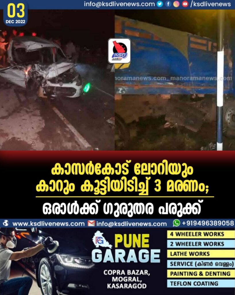 കാസർകോട് ലോറിയും കാറും കൂട്ടിയിടിച്ച് 3 മരണം; ഒരാൾക്ക് ഗുരുതര പരുക്ക്