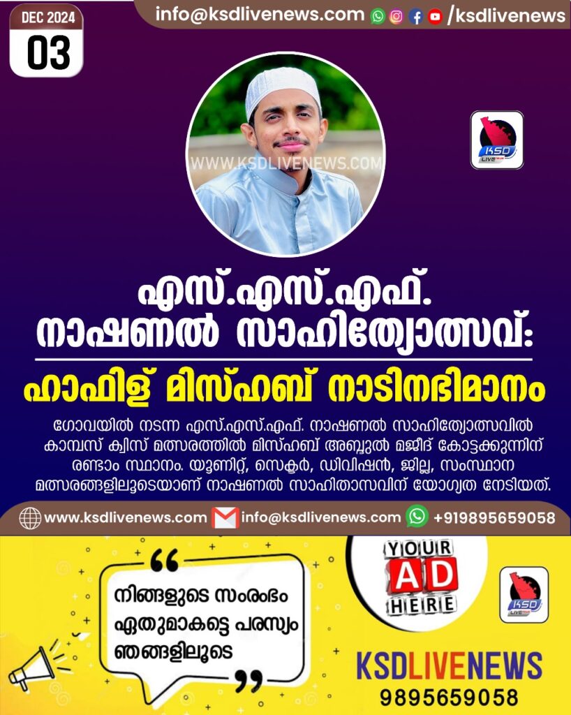 മൊഗ്രാൽ പുത്തൂർ: ഗോവയിൽ നടന്ന SSF നാഷണൽ സാഹിത്യോത്സവിൽ കാമ്പസ് ക്വിസ് മത്സരത്തിൽ മിസ്ഹബ് അബ്ദുൽ മജീദ് കോട്ടക്കുന്നിന് രണ്ടാം സ്ഥാനം.