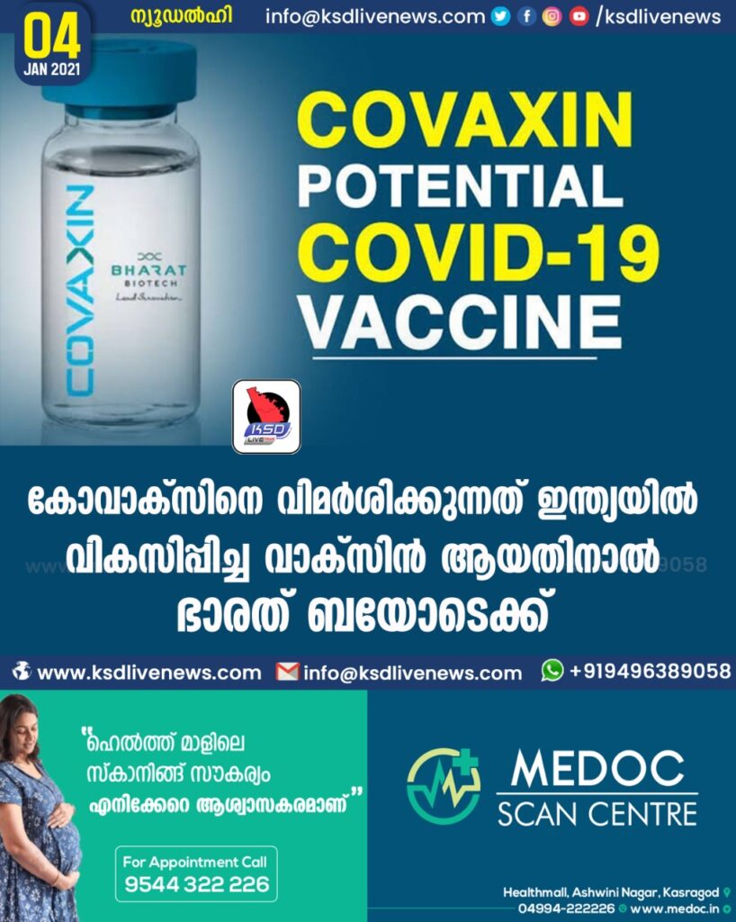 ഇന്ത്യൻ കമ്പനികളെ വിമർശിക്കാനുള്ള പ്രവണതയാണ് കോവാക്സിനോടുള്ള എതിർപ്പിനും പിന്നിൽ. എന്നാൽ ഇന്ത്യക്ക് കണ്ടുപിടിത്തങ്ങൾ നടത്താനാവും. കോപ്പിയടിക്കാൻ മാത്രം അറിയുന്ന രാജ്യമല്ല ഇന്ത്യ. ഇന്ത്യൻ കമ്പനി വികസിപ്പിച്ചു എന്നതിന്റെ പേരിൽ ഇന്ത്യയിൽനിന്നുതന്നെ വിമർശം ഉയരുന്നത് അംഗീകരിക്കാനാവില്ല. ഇന്ത്യൻ കമ്പനികൾക്കെതിരെ ലോകത്തിന്റെ വിവിധ ഭാഗങ്ങളിൽനിന്ന് വിമർശം ഉയരുന്നത് എന്തുകൊണ്ടാണെന്ന് അറിയില്ല.