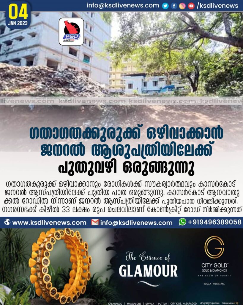 കാസർകോട് ജനറൽ ആസ്പത്രിയിലേക്ക് പുതിയ പാത ഒരുങ്ങുന്നു. കാസർകോട് ആനവാതുക്കൽ റോഡിൽ നിന്നാണ് ജനറൽ ആസ്പത്രിയിലേക്ക് പുതിയ പാത