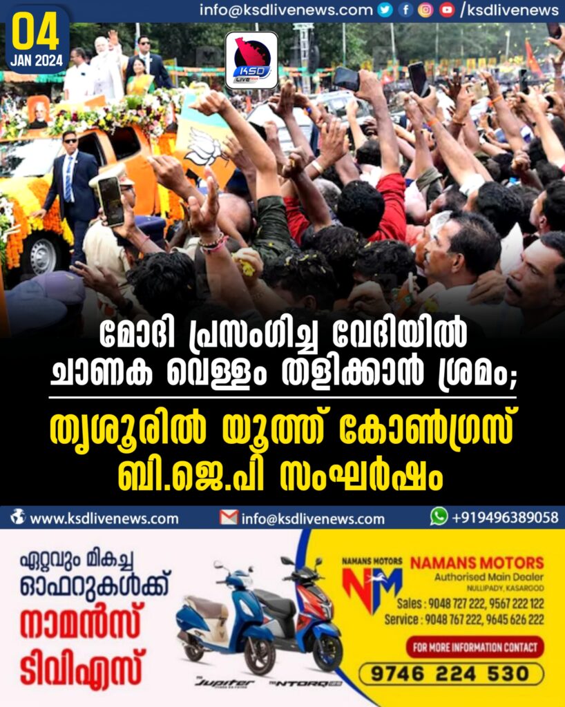 മോദി പ്രസംഗിച്ച വേദിയിൽ ചാണക വെള്ളം തളിക്കാൻ ശ്രമം; തൃശൂരിൽ യൂത്ത് കോൺഗ്രസ്-ബിജെപി സംഘർഷം