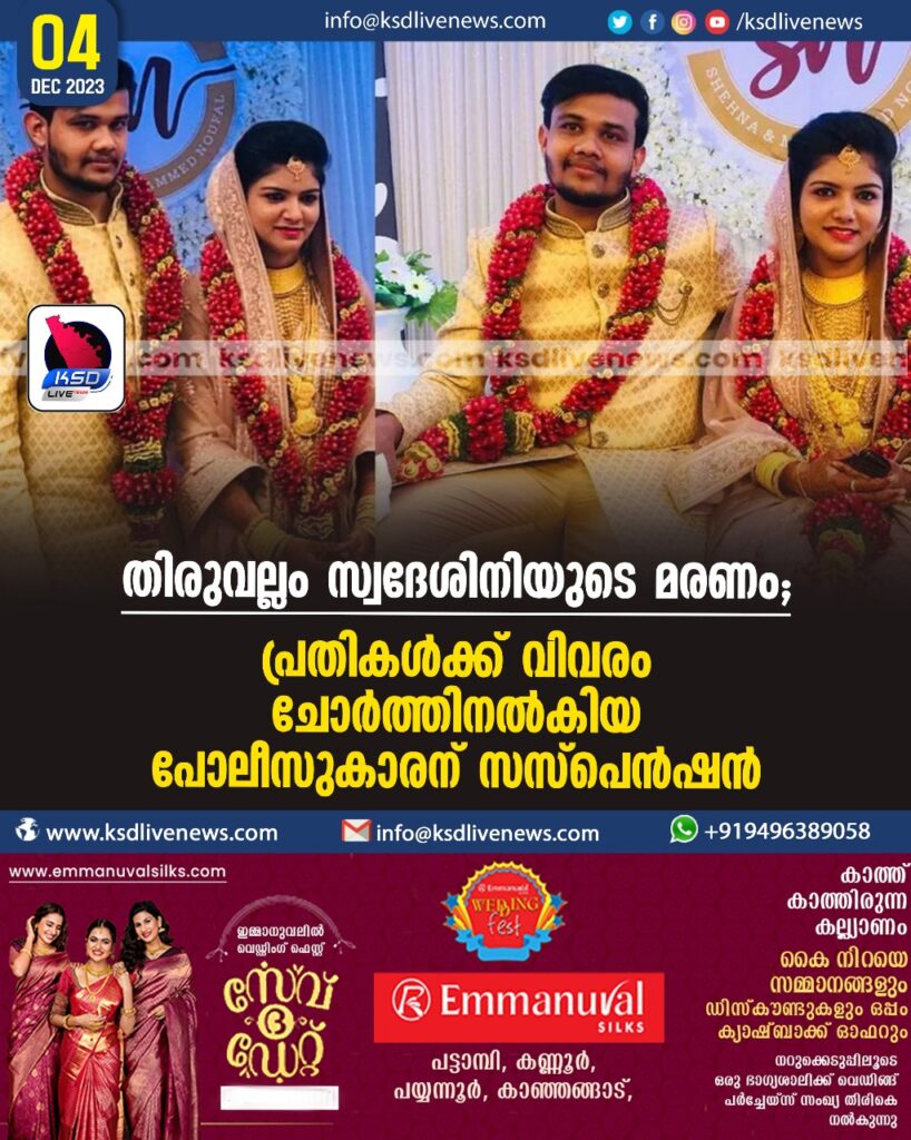 തിരുവല്ലം സ്വദേശിനിയുടെ മരണം: പ്രതികള്‍ക്ക് വിവരം ചോര്‍ത്തിനല്‍കിയ പോലീസുകാരന് സസ്‌പെന്‍ഷന്‍