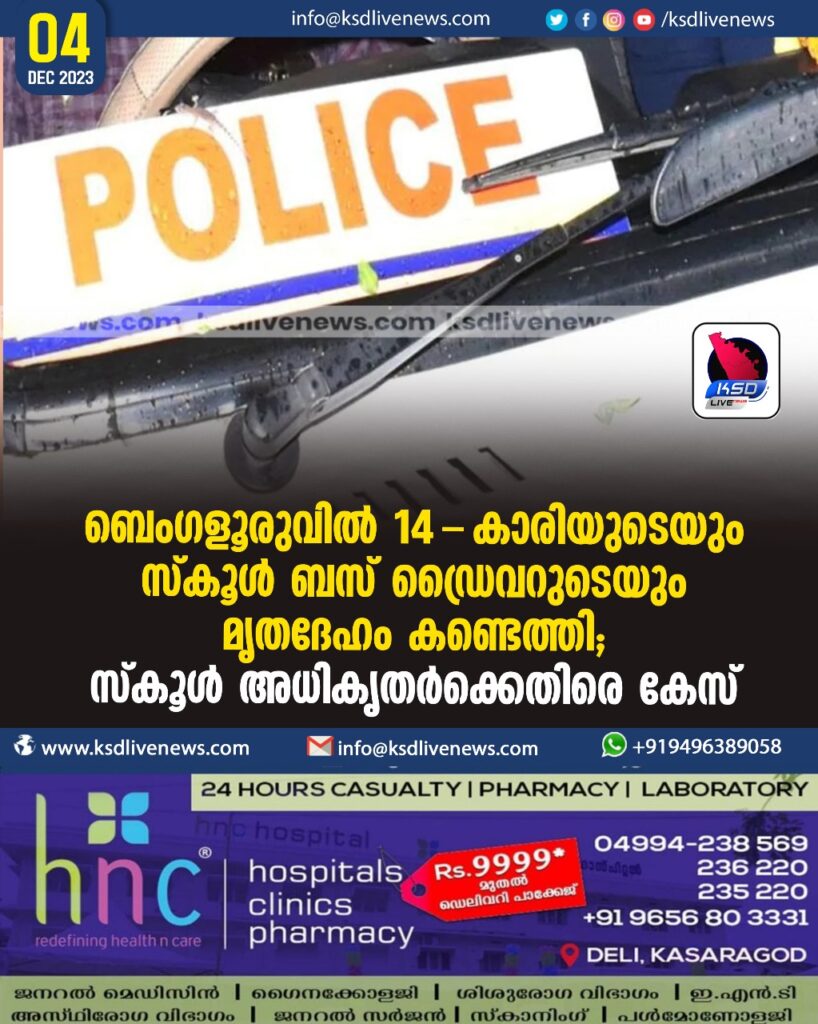 ബെംഗളൂരുവില്‍ 14-കാരിയുടെയും സ്‌കൂള്‍ ബസ് ഡ്രൈവറുടെയും മൃതദേഹം കണ്ടെത്തി; സ്‌കൂള്‍ അധികൃതര്‍ക്കെതിരെ കേസ്