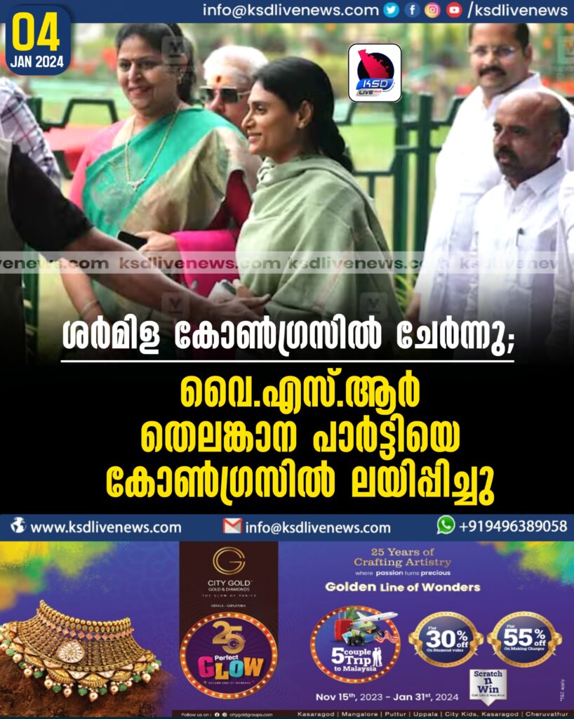 വൈഎസ്ആർ തെലങ്കാന പാർട്ടിയെ കോൺഗ്രസിൽ ലയിപ്പിച്ചു. ‘‘കോൺഗ്രസ് ഇപ്പോഴും രാജ്യത്തെ ഏറ്റവും വലിയ സെക്കുലർ പാർട്ടിയാണ്. കോണ്ഗ്രസ് എല്ലായ്പ്പോഴും ഇന്ത്യയുടെ യഥാർഥ സംസ്കാരം ഉയർത്തിപ്പിടിക്കുകയും നമ്മുടെ രാജ്യത്തിന്റെ അടിത്തറ കെട്ടിപ്പടുക്കുകയും ചെയ്തിട്ടുണ്ട്’’– അവർ പറഞ്ഞു.