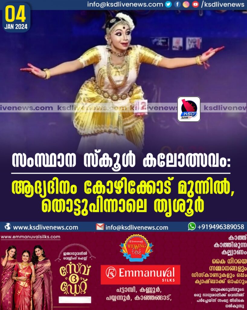 സംസ്ഥാന സ്കൂള് കലോത്സവം: ആദ്യദിനം കോഴിക്കോട് മുന്നില്, തൊട്ടുപിന്നാലെ തൃശൂര്