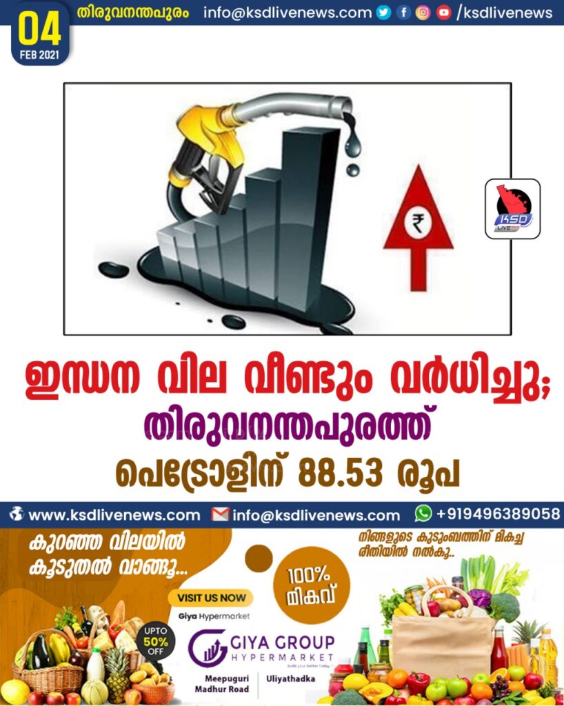 ഇന്ധന വില വീണ്ടും വർധിച്ചു ; തിരുവനന്തപുരത്ത് പെട്രോളിന് 88.53 രൂപ.