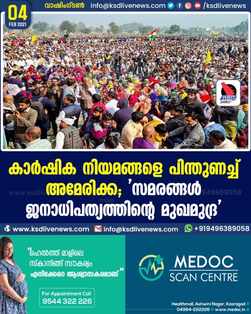 കാര്‍ഷിക നിയമങ്ങളെ പിന്തുണച്ച് അമേരിക്ക; ‘സമരങ്ങൾ ജനാധിപത്യത്തിന്റെ മുഖമുദ്ര’