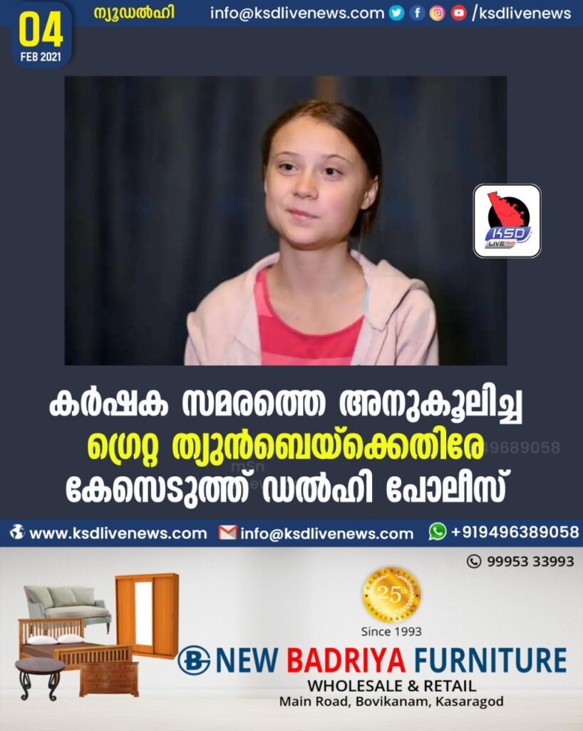 കര്ഷക സമരത്തെ അനുകൂലിച്ച ഗ്രെറ്റ ത്യുന്ബെയ്ക്കെതിരേ കേസെടുത്ത് ഡല്ഹി പോലീസ്