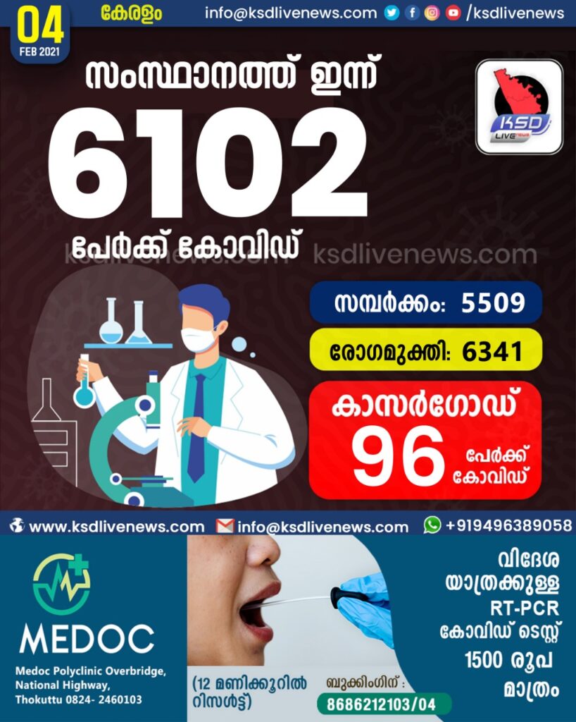 സംസ്ഥാനത്ത് ഇന്ന് 6102 പേർക്ക് കോവിഡ് സ്ഥിരീകരിച്ചു. സമ്പർക്കം വഴി 5509 പേർക്കും ; ആശ്വാസമായി 6341 പേർക്ക് രോഗ മുക്തിയും ; കാസർഗോഡ് ജില്ലയിൽ 96 പേർക്ക് പുതിയ കോവിഡ് കേസുകൾ ; മരണം 17