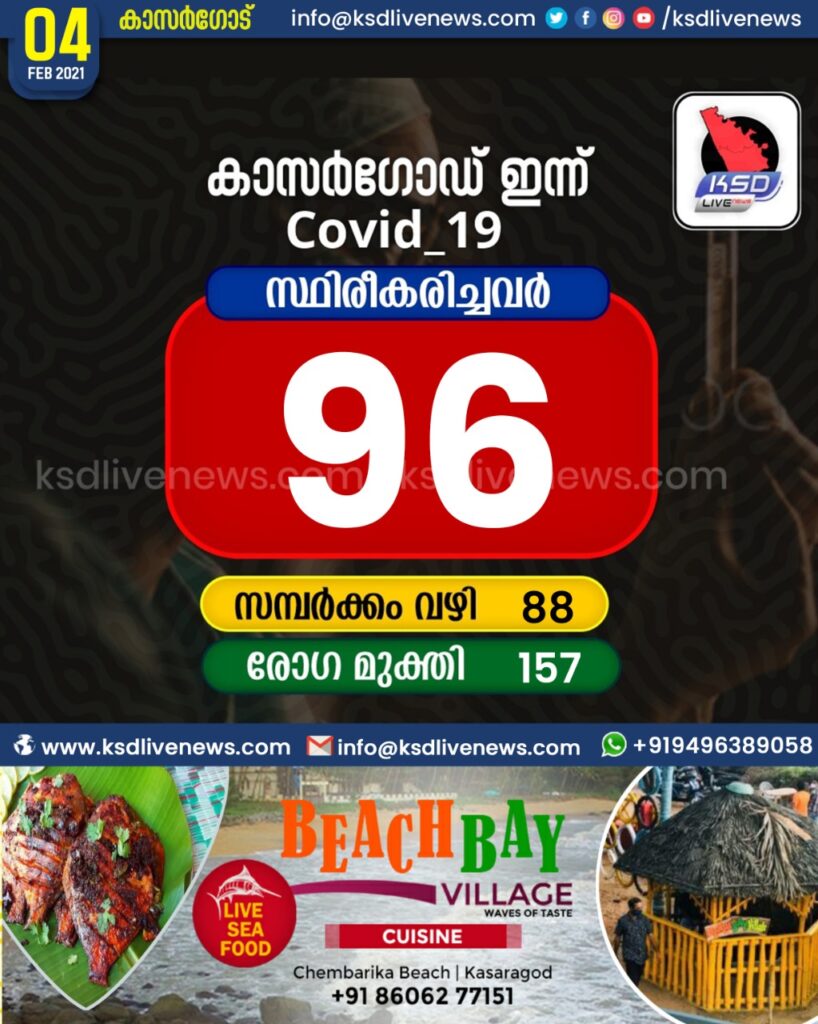 കാസര്കോട് ജില്ലയില് 96 പേര്ക്ക് കോവിഡ്, 157 പേര്ക്ക് രോഗമുക്തി