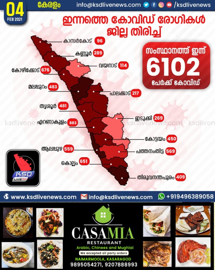 കേരളത്തില് ഇന്ന് 6102 പേര്ക്ക് കോവിഡ്-19 സ്ഥിരീകരിച്ചു. എറണാകുളം 833, കോഴിക്കോട് 676, കൊല്ലം 651, പത്തനംതിട്ട 569, ആലപ്പുഴ 559, മലപ്പുറം 489, തൃശൂര് 481, കോട്ടയം 450, തിരുവനന്തപുരം 409, കണ്ണൂര് 289, ഇടുക്കി 269, പാലക്കാട് 217, വയനാട് 114, കാസര്ഗോഡ് 96 എന്നിങ്ങനേയാണ് ജില്ലകളില് ഇന്ന് രോഗ ബാധ സ്ഥിരീകരിച്ചത്.