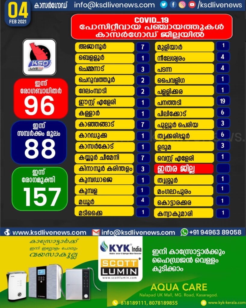 കാസർഗോഡ് ജില്ലയിൽ ഇന്ന് കോവിഡ് സ്ഥിരീകരിച്ചവരുടെ പഞ്ചായത്ത് തിരിച്ചുള്ള സ്ഥിതി വിവര കണക്ക്