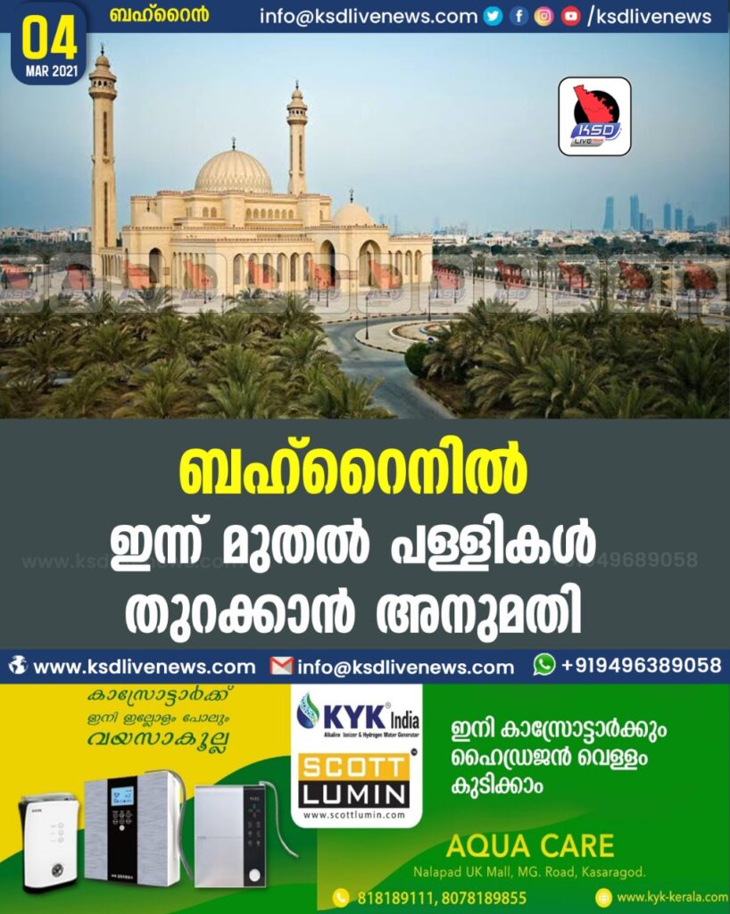 ബഹ്റൈനില് ഇന്ന് മുതല് പള്ളികള് തുറക്കാന് അനുമതി.സുപ്രീം കൗണ്സില് ഫോര് ഇസ്ലാമിക് അഫയേഴ്സിന്റെയും കൊവിഡ് മെഡിക്കല് ടാസ്ക്ഫോഴ്സിന്റെയും ശുപാര്ശകളും സുന്നി, ജാഫാരി എന്ഡോവ്മെന്റുകളുമായി കൂടിയാലോചിച്ചതിനെ തുടര്ന്നാണ് തീരുമാനം.
