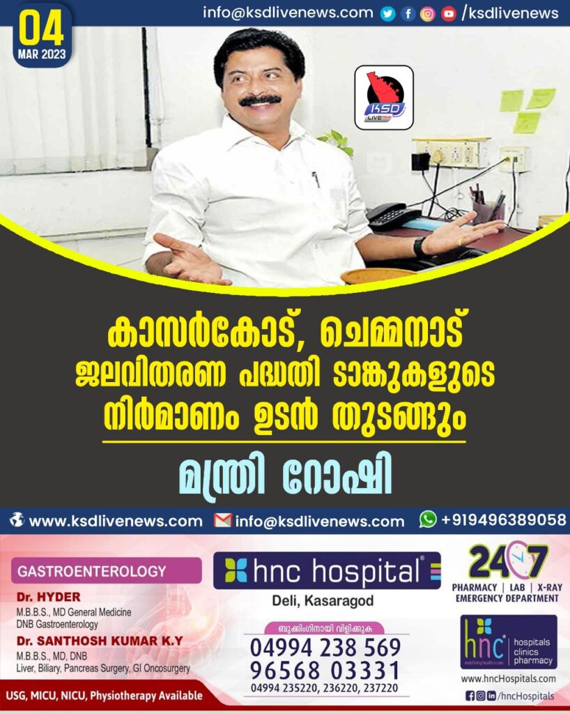 കാസർകോട്, ചെമ്മനാട് ജലവിതരണ പദ്ധതി ടാങ്കുകളുടെ നിർമാണം ഉടൻ തുടങ്ങും: മന്ത്രി റോഷി