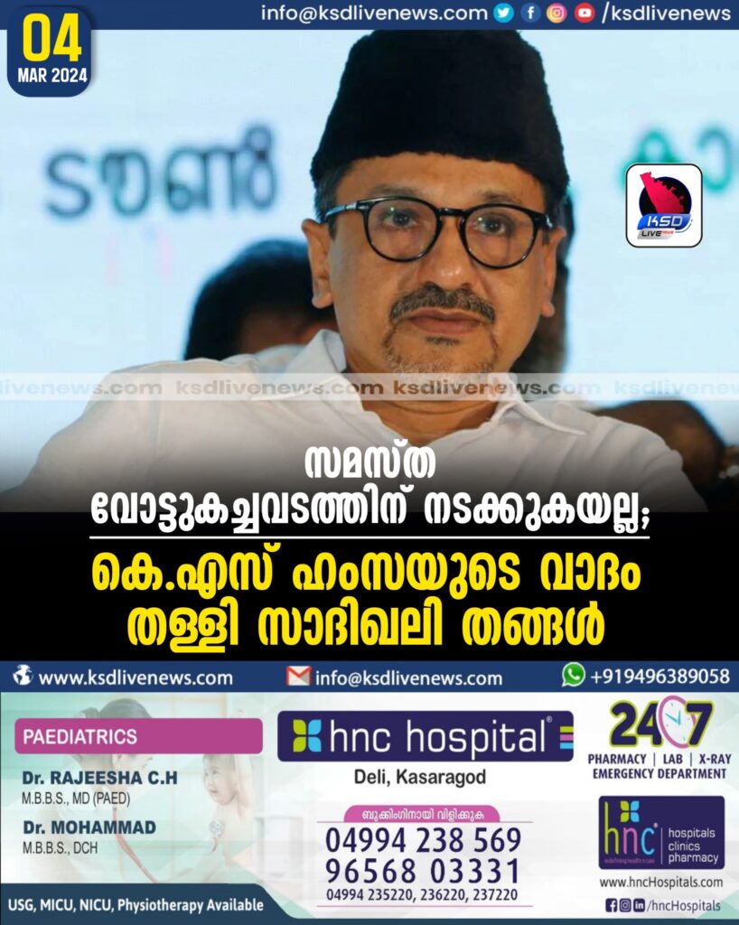 കോഴിക്കോട്: സമസ്ത വോട്ടുകിട്ടുമെന്ന പൊന്നാനിയിലെ എല്.ഡി.എഫ് സ്ഥാനാര്ഥി കെ.എസ്. ഹംസയുടെ അവകാശവാദം തള്ളി പാണക്കാട് സയ്യിദ് സാദിഖലി ശിഹാബ് തങ്ങൾ. സമസ്ത വോട്ടുകച്ചവടത്തിന് നടക്കുകയല്ലെന്ന് അദ്ദേഹം പറഞ്ഞു. രാമനാഥപുരത്ത് ലീഗ് തന്നെ ജയിക്കുമെന്നും മോദി വന്നാലും മുസ്ലിം ലീഗിന് ഭയമില്ലെന്നും പറഞ്ഞ സാദിഖലി ശിഹാബ് തങ്ങൾ മോദിയുടേത് വിദ്വേഷ രാഷ്ട്രീയമാണെന്നും പ്രസ്താവിച്ചു. മൂന്നാം സീറ്റ് വിവാദം നേരത്തെ അവസാനിച്ചതാണെന്നും അദ്ദേഹം മാധ്യമങ്ങളോട് പറഞ്ഞു. മുസ്ലിം ലീഗിനെ പ്രകോപിപ്പിക്കാൻ പലരും ശ്രമിക്കുന്നുണ്ട്. ചെറിയ ചെറിയ കാര്യങ്ങൾ പറഞ്ഞ് വലിയ ലക്ഷ്യങ്ങൾ മറക്കരുത്. മുസ്ലിം ലീഗിൻ്റെ രാഷ്ട്രീയം ശരിയുടെ നിലപാടാണ്. കൂടിയാലോചിച്ചാണ് എല്ലാ തീരുമാനവുമെടുക്കുന്നത്. ലീഗിൻ്റെ തീരുമാനങ്ങളിൽ ദൈവഹിതമുണ്ടെന്നും സാദിഖലി ശിഹാബ് തങ്ങൾ പറഞ്ഞു. ചെറിയ ചെറിയ കാര്യങ്ങൾ പറഞ്ഞ് വലിയ ലക്ഷ്യങ്ങൾ മറക്കരുത്. മുസ്ലിം ലീഗിനെ പ്രകോപിപ്പിക്കാൻ പലരും ശ്രമിക്കുന്നുണ്ട്. ഏത് വന്മരത്തെ വീഴ്ത്താനും ചെറിയ വാൾ മതി. ലീഗിന് ഒരു പേടിയുമില്ല. ഫാസിസത്തിനെതിരായ ഏത് പോരാട്ടത്തിനും ലീഗ് തയ്യാറാണെന്നും രാമനാഥപുരത്ത് ഒരു ആശങ്കയും ഇല്ലെന്നും അദ്ദേഹം പറഞ്ഞു