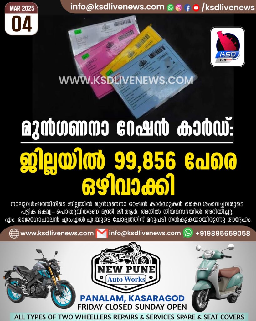 പൊയിനാച്ചി: നാലുവർഷത്തിനിടെ ജില്ലയിൽ മുൻഗണനാ റേഷൻ കാർഡുകൾ കൈവശംവെച്ചവരുടെ പട്ടിക ഭക്ഷ്യ-പൊതുവിതരണ മന്ത്രി ജി.ആർ. അനിൽ നിയമസഭയിൽ അറിയിച്ചു. എം. രാജഗോപാലൻ എം.എൽ.എ.യുടെ ചോദ്യത്തിന് മറുപടി നൽകുകയായിരുന്നു അദ്ദേഹം.