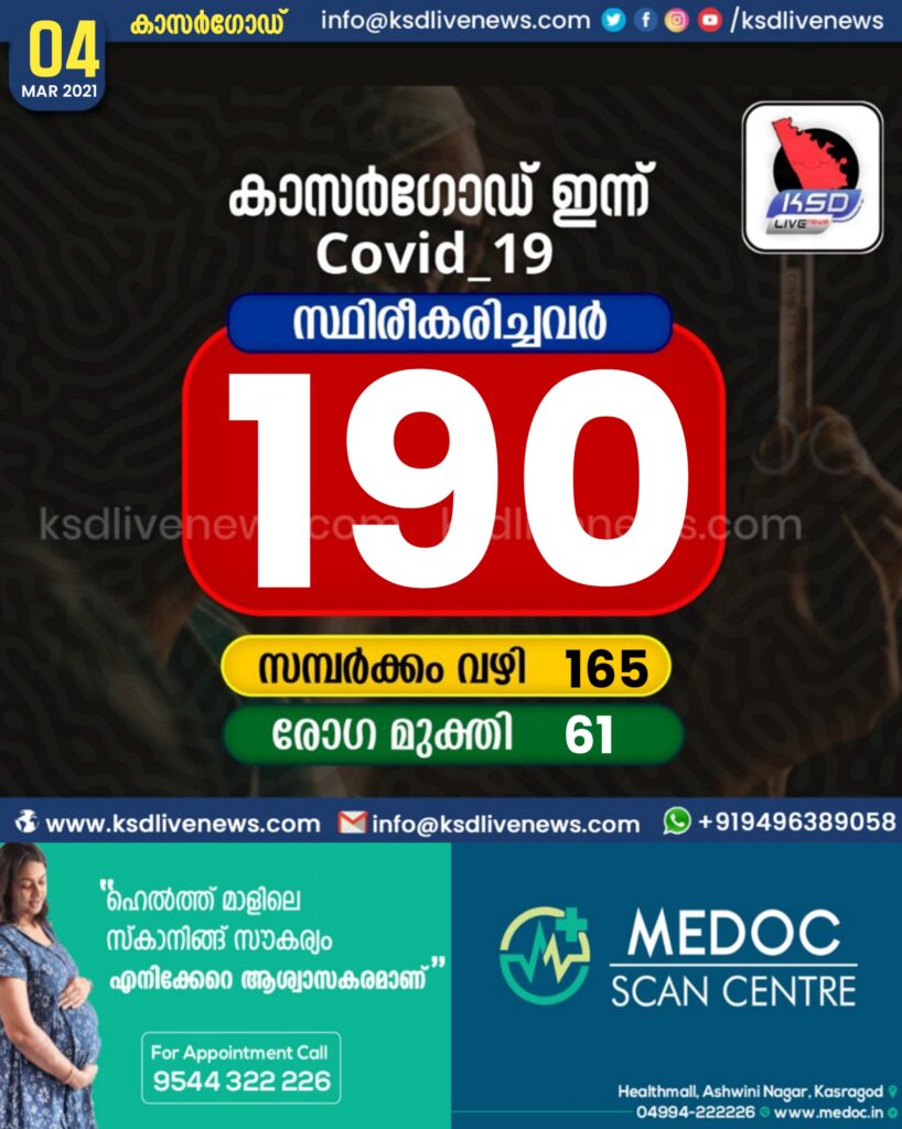 കാസർഗോഡ് ജില്ലയിൽ ഇന്ന് 190 പേർക്ക് കോവിഡ് സ്ഥിരീകരിച്ചു. സമ്പർക്കം വഴി 165 പേർക്കും. 61 പേർക്ക് രോഗമുക്തി