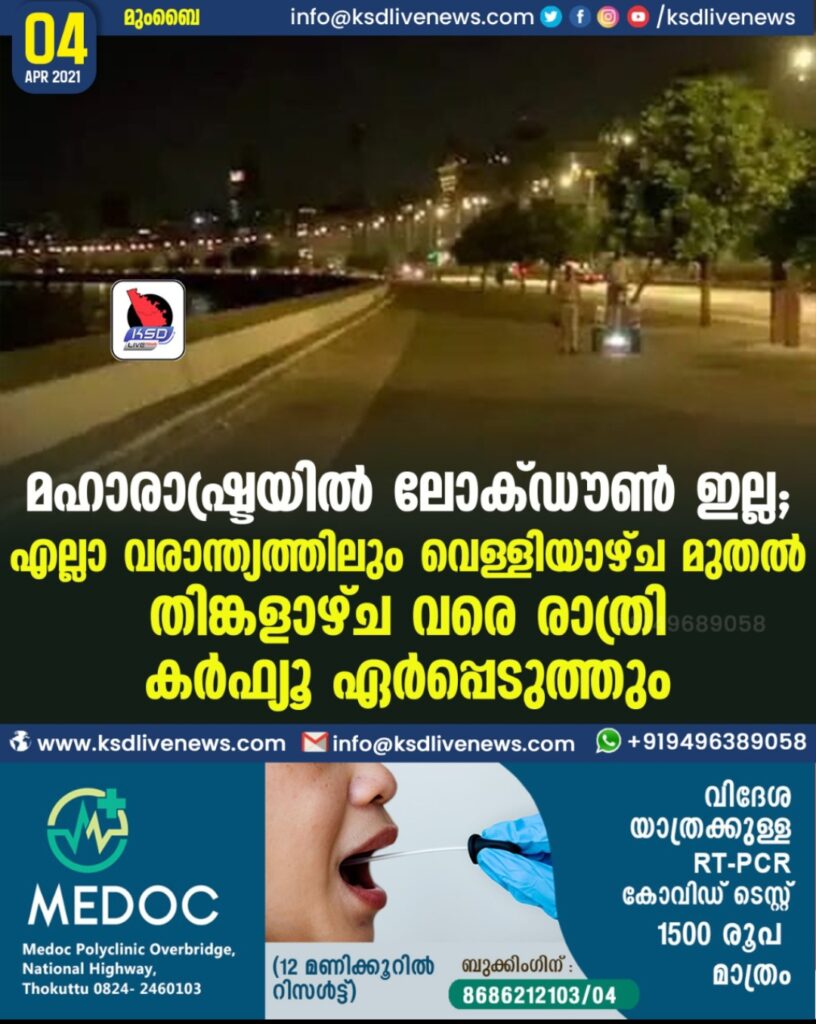 മഹാരാഷ്ട്രയിൽ ലോക്സ്ഡൗൺ ഇല്ല ; എല്ലാ വരാന്ത്യത്തിലും വെള്ളിയാഴ്ച മുതൽ തിങ്കളാഴ്ച വരെ രാത്രി കർഫ്യൂ ഏർപ്പെടുത്തും