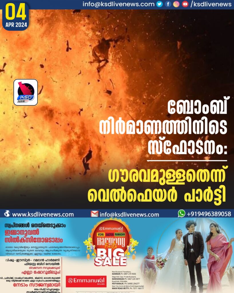 ബോംബ് നിര്മാണത്തിനിടെ സ്ഫോടനം: ഗൗരവമുള്ളതെന്ന് വെല്ഫെയര് പാര്ട്ടി