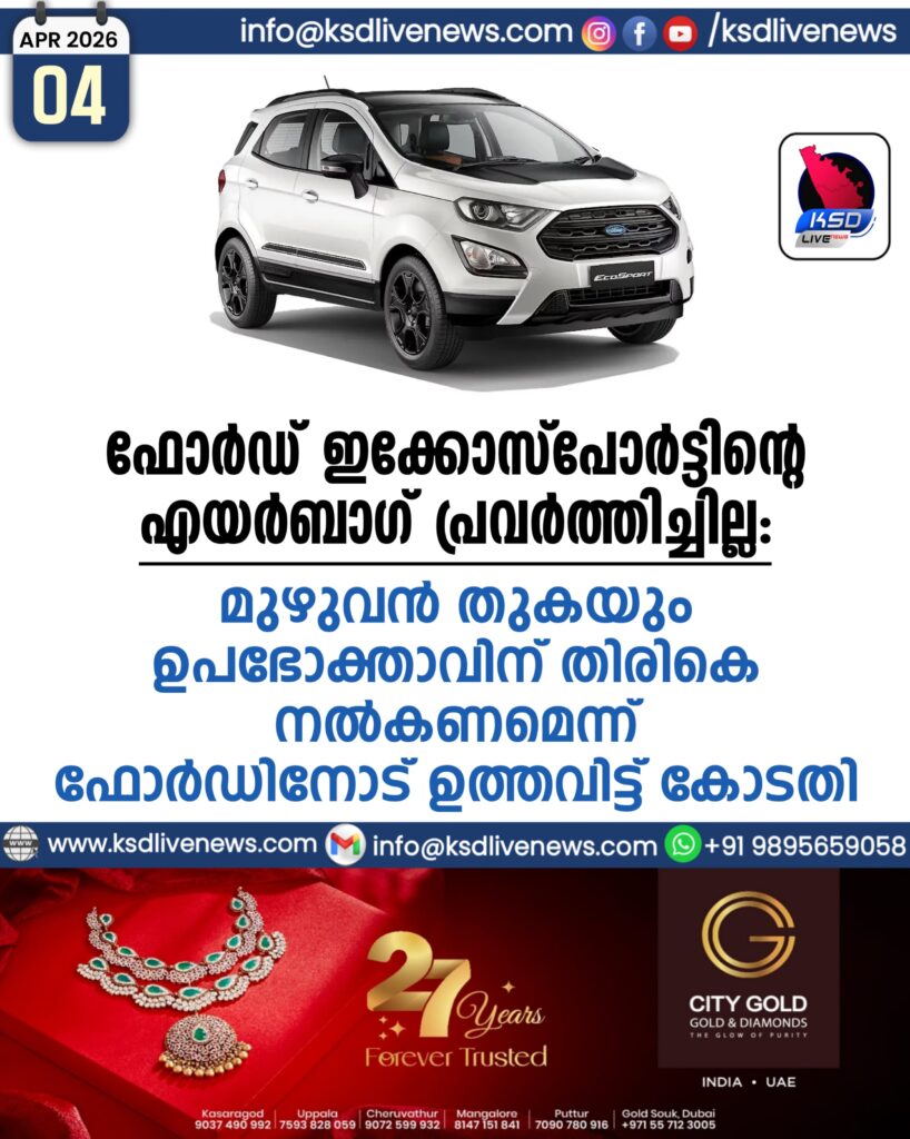 ഫോർഡ് ഇക്കോസ്പോർട്ടിന്റെ എയർബാഗ് പ്രവർത്തിച്ചില്ല: മുഴുവൻ തുകയും ഉപഭോക്താവിന് തിരികെ നല്കണമെന്ന് ഫോർഡിനോട് ഉത്തവിട്ട് കോടതി