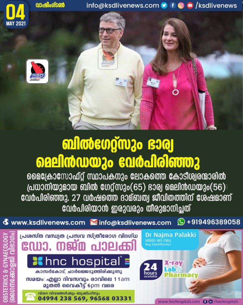വാഷിങ്ടണ്‍: മൈക്രോസോഫ്റ്റ് സ്ഥാപകനും ലോകത്തെ കോടീശ്വരന്മാരില്‍ പ്രധാനിയുമായ ബില്‍ ഗേറ്റ്‌സും(65) ഭാര്യ മെലിന്‍ഡയും(56) വേര്‍പിരിഞ്ഞു. 27 വര്‍ഷത്തെ ദാമ്പത്യ ജീവിതത്തിന് ശേഷമാണ് വേര്‍പിരിയാന്‍ ഇരുവരും തീരുമാനിച്ചത്. ലോകത്തിലെ ഏറ്റവും ആസ്തിയുള്ള ദമ്പതികളിലൊന്നാണ് ബില്‍ഗേറ്റ്‌സും മെലിന്‍ഡയും. 130 ബില്ല്യണ്‍ ഡോളറാണ് ഇവരുടെ സമ്പാദ്യം. സമ്പാദ്യത്തിന്റെ നല്ലൊരു പങ്കും ഇവര്‍ ജീവകാരുണ്യ പ്രവര്‍ത്തനത്തിനായി ചെലവാക്കുന്നുവെന്ന പ്രത്യേകതയുമുണ്ട്.