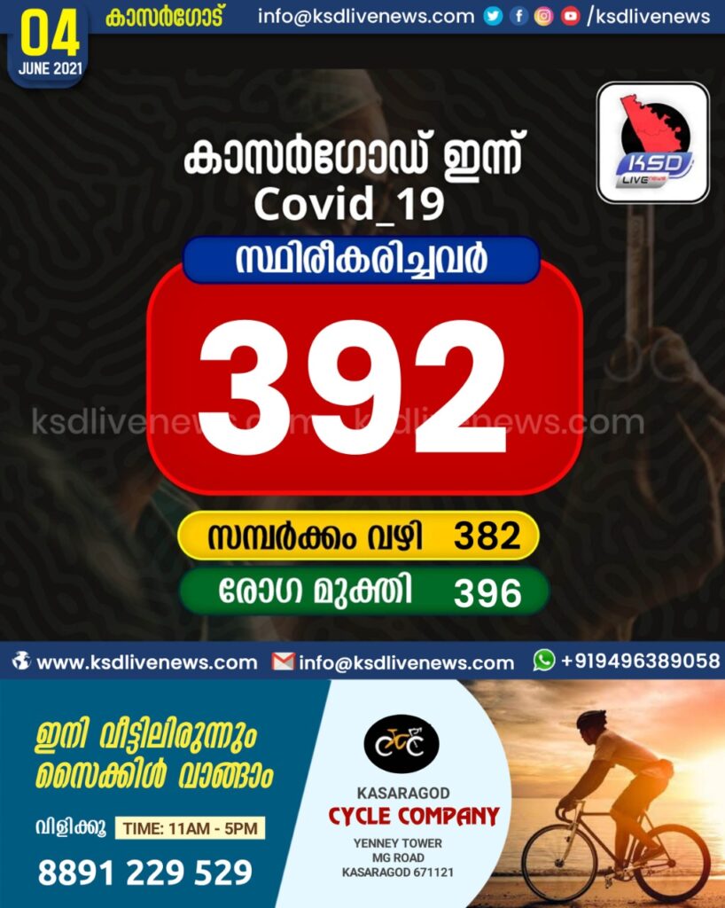 കാസർഗോഡ് ജില്ലയിൽ ഇന്ന് 392 പേർക്ക് കോവിഡ് സ്ഥിരീകരിച്ചു. സമ്പർക്കം വഴി 382 പേർക്കും. 396 പേർക്ക് രോഗമുക്തിSHARE THIS ONകാസർഗോഡ് ജില്ലയിൽ ഇന്ന് 392 പേർക്ക് കോവിഡ് സ്ഥിരീകരിച്ചു. സമ്പർക്കം വഴി 382 പേർക്കും. 396 പേർക്ക് രോഗമുക്തി