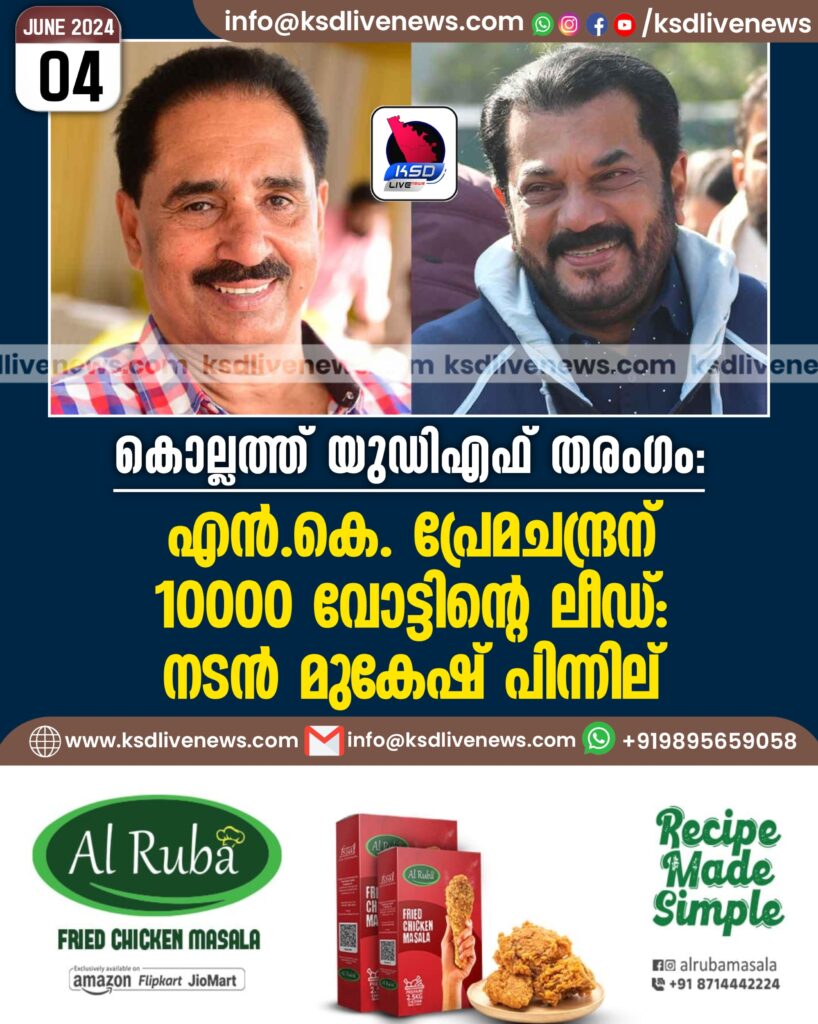 കൊല്ലത്ത് യുഡിഎഫ് തരംഗം, എൻ.കെ.പ്രേമചന്ദ്രന് 10000 വോട്ടിന്റെ ലീഡ്; നടൻ മുകേഷ് പിന്നില്