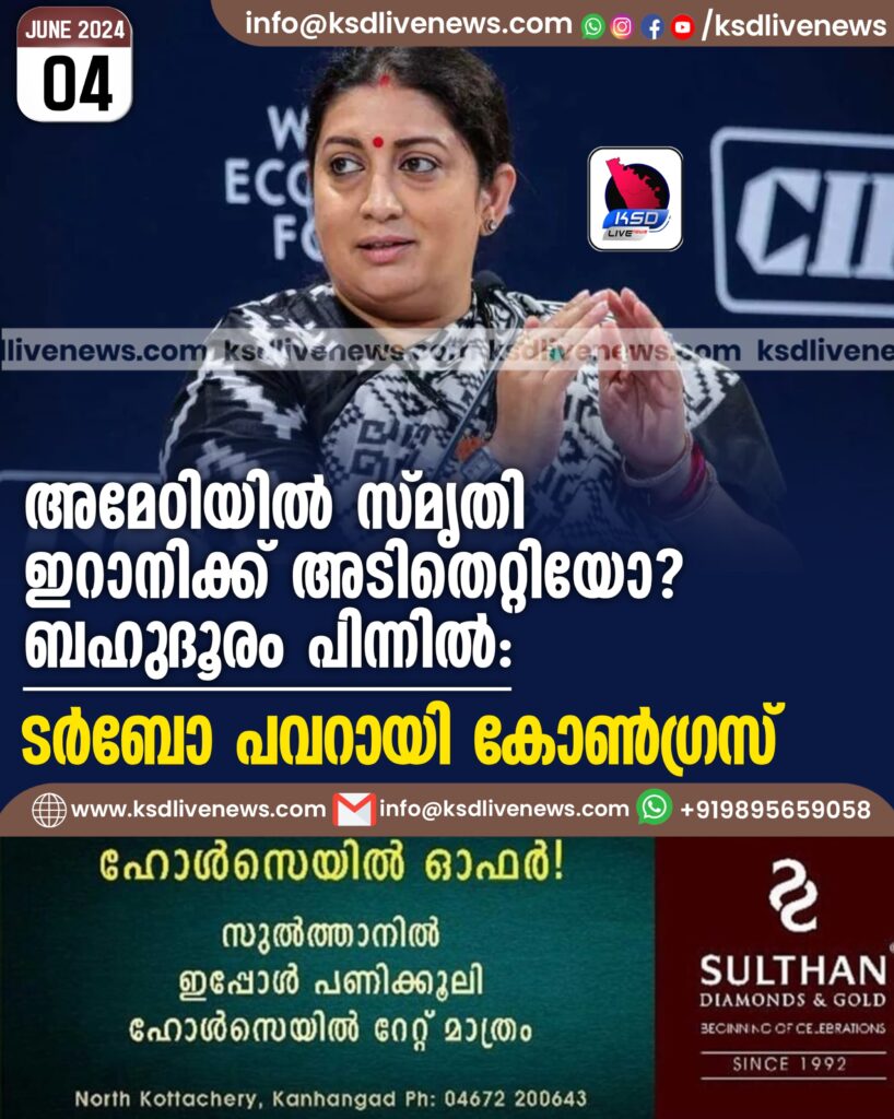 2019-ല് അമേഠിയില് രാഹുല്ഗാന്ധിയെ പരാജയപ്പെടുത്തിയാണ് സ്മൃതി ഇറാനി ലോക്സഭയിലെത്തിയത്. ഇത്തവണയും ഈസി വാക്കോവര് പ്രതീക്ഷിച്ച് അമേഠിയില് മത്സരിച്ച സ്മൃതി ഇറാനിക്ക് കാര്യങ്ങള് എളുപ്പമല്ലെന്നാണ് ആദ്യമണിക്കൂറുകളിലെ ഫലസൂചനകള്. ഇതിനൊപ്പം ഉത്തര്പ്രദേശില് ഇന്ത്യ സഖ്യം നടത്തിയ അപ്രതീക്ഷ മുന്നേറ്റവും എടുത്തുപറയേണ്ടതാണ്.