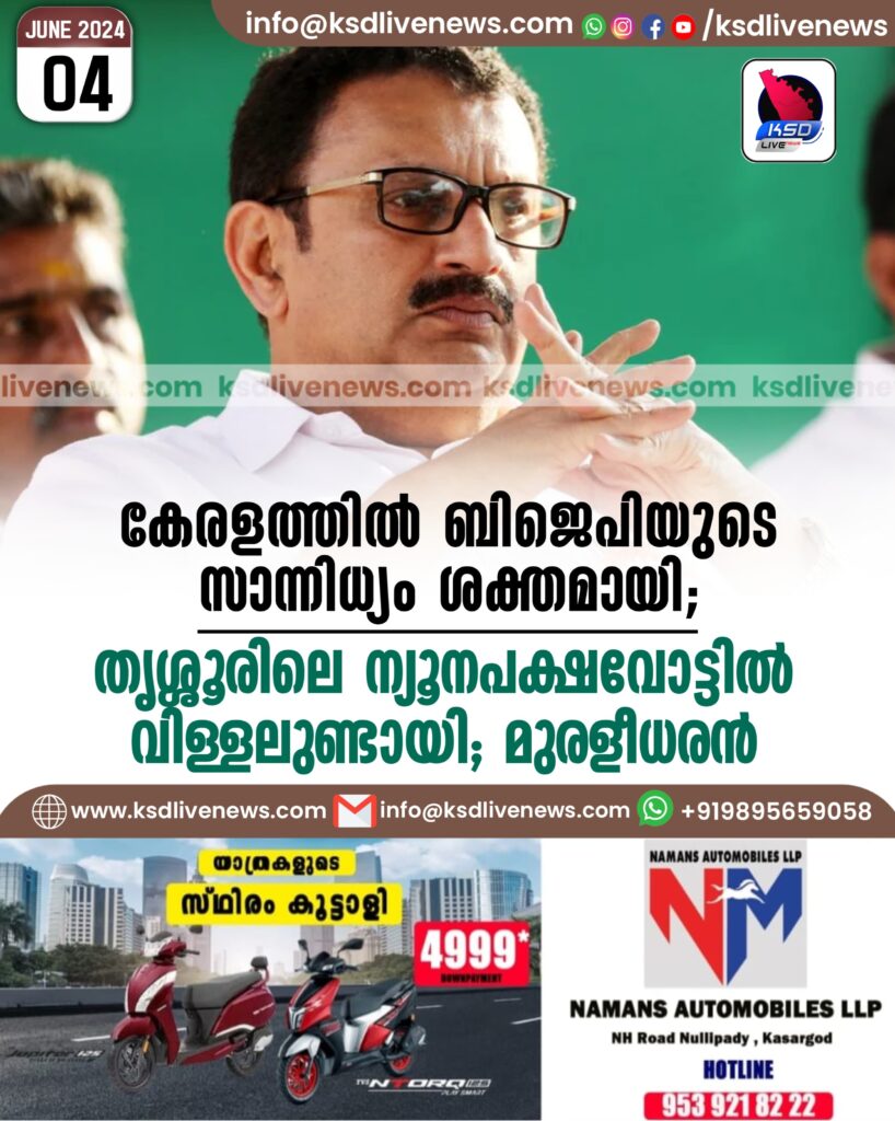 കേരളത്തില് ബിജെപിയുടെ സാന്നിധ്യം ശക്തമായി; തൃശ്ശൂരിലെ ന്യൂനപക്ഷവോട്ടില് വിള്ളലുണ്ടായി-മുരളീധരന്