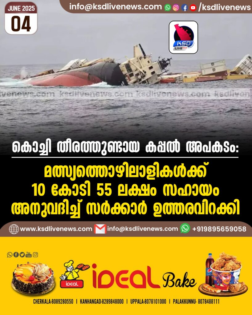 കൊച്ചി തീരത്തുണ്ടായ കപ്പല്‍ അപകടം: മത്സ്യത്തൊഴിലാളികള്‍ക്ക് 10 കോടി 55 ലക്ഷം സഹായം അനുവദിച്ച്‌ സര്‍ക്കാര്‍ ഉത്തരവിറക്കി
