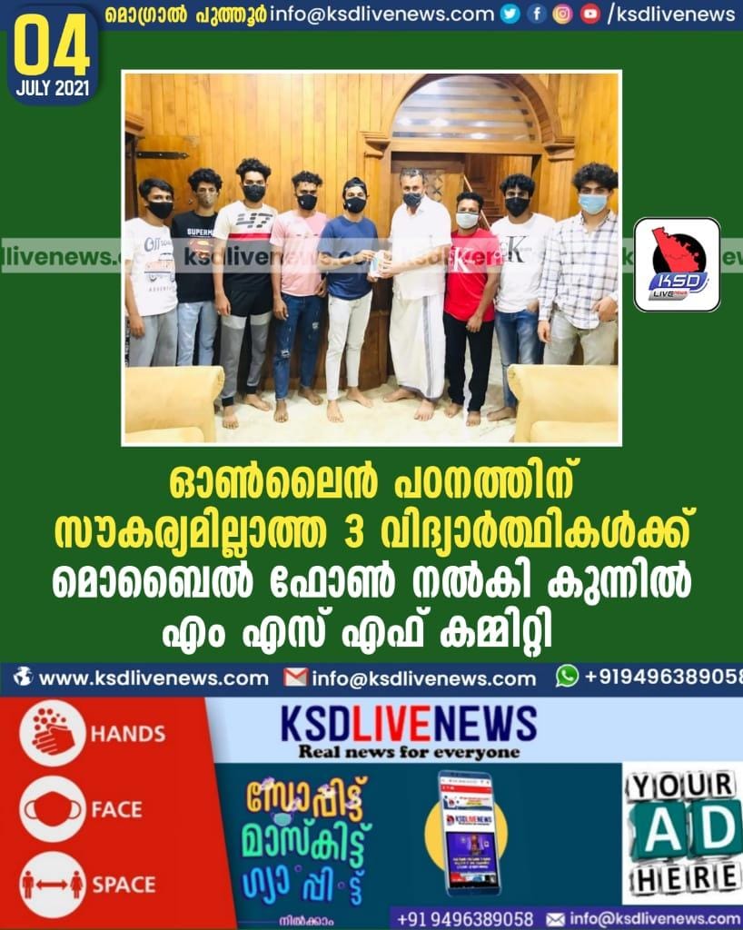 ഓൺലൈൻ പഠനത്തിന് സൗകര്യമില്ലാത്ത 3 വിദ്യാർത്ഥികൾക്ക് മൊബൈൽ ഫോൺ നൽകി കുന്നിൽ എം എസ് എഫ് കമ്മിറ്റി