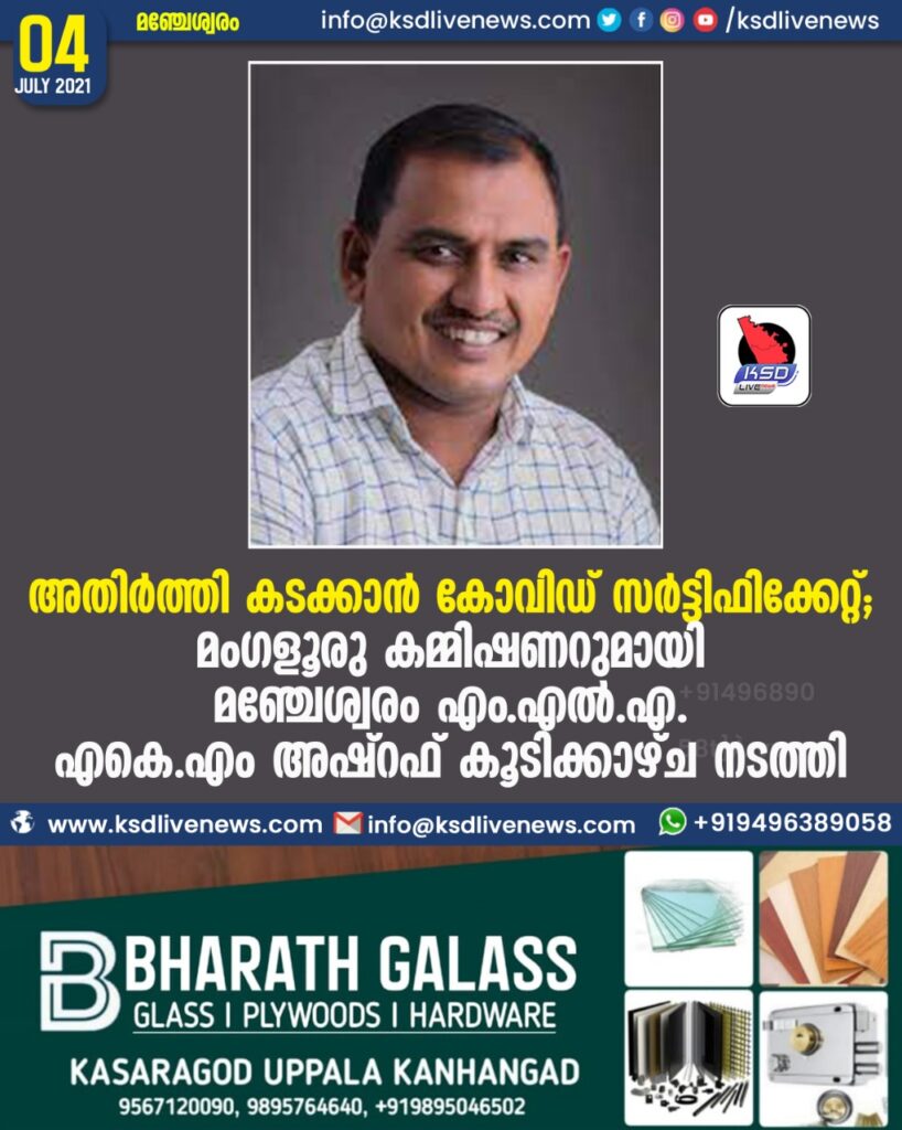 അതിർത്തി കടക്കാൻ കോവിഡ് സർട്ടിഫിക്കേറ്റ്; മംഗളൂരു കമ്മിഷണറുമായി മഞ്ചേശ്വരം എകെ.എം അഷ്റഫ് എം.എൽ.എ. കൂടിക്കാഴ്ച നടത്തി