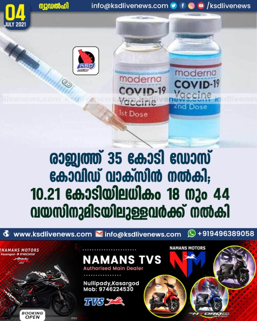 രാജ്യത്ത് 35 കോടി ഡോസ് കോവിഡ് വാക്സിന് നല്കി, 10.21 കോടിയിലധികം 18നു44 വയസിനുമിടയിലുള്ളവര്ക്ക് നല്കി