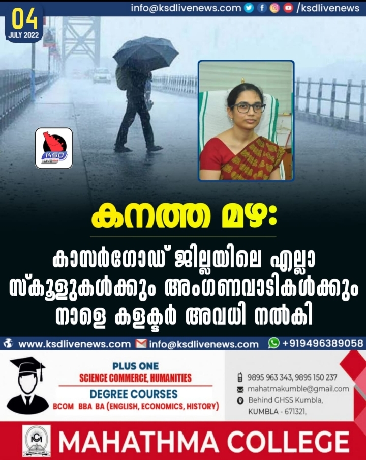 കനത്ത മഴ: കാസർഗോഡ് ജില്ലയിലെ എല്ലാ സ്കൂളുകൾക്കും അംഗണവാടികൾക്കും നാളെ കളക്ടർ അവധി നൽകി