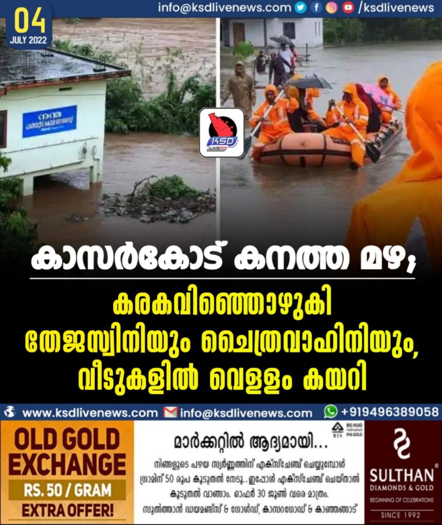 കാസര്‍കോട് കനത്ത മഴ; കരകവിഞ്ഞൊഴുകി തേജസ്വിനിയും ചൈത്രവാഹിനിയും, വീടുകളില്‍ വെളളം കയറി